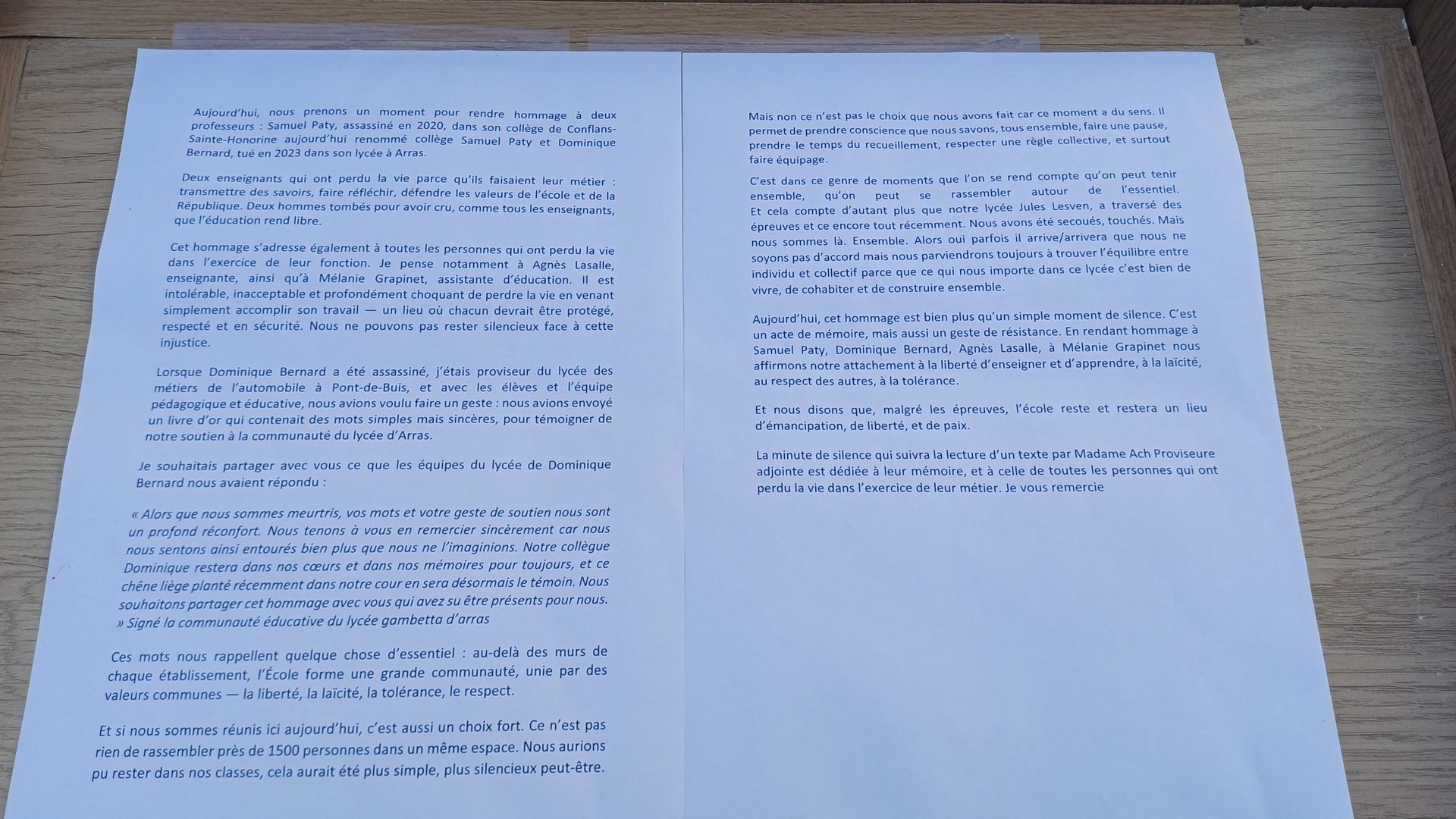 Mme Ach Proviseure adjointe du lycée général et technologique a lu le texte de la chanson "À Samuel Paty" par Gauvain Sers, chanteur dont le texte a été lu lors de l’hommage national.
