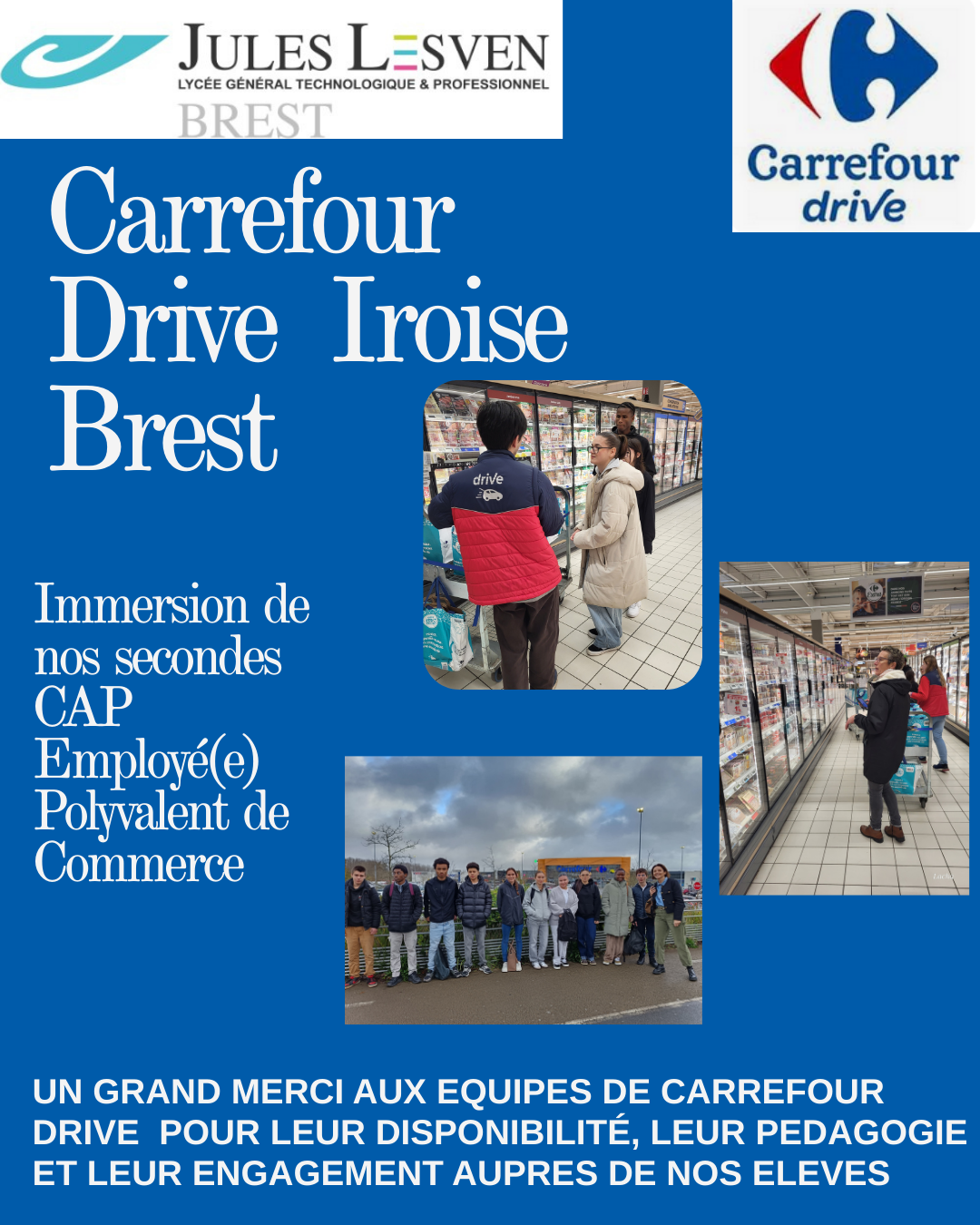 Les trois classes de seconde CAP Employé Polyvalent de Commerce ont eu l’opportunité de découvrir les coulisses du Carrefour Drive lors d’une visite riche en enseignements.