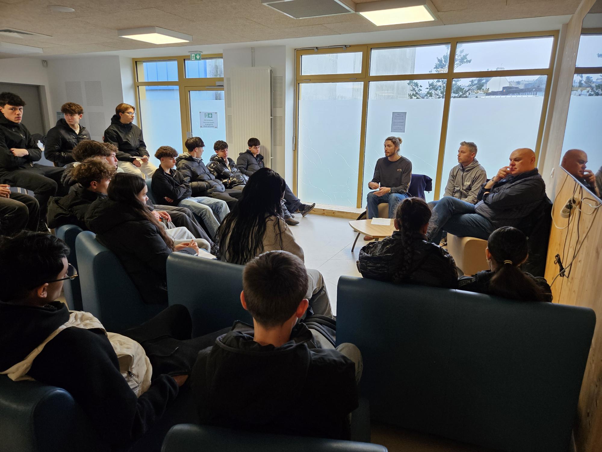 Professionnels présents : Vivien Majorel (enseignant à l’ENSTA, coach sportif et ancien étudiant aux Etats-Unis avec une bourse sportive) ; Benoit Nicolas (professeur d’EPS et ancien athlète de Haut Niveau, champion du monde de duathlon) ; Erel Abguillerm (IRSS, ENSTA) ; Anaëlle De Blasi (IRSS) ; Manon Salaün et Eva Damota (étudiantes en 3ème année de Kiné, passées par PASS et STAPS°; Anais Aballea Tregouet (Kiné du sport et de HN) ; Pierre-Yves Kerbrat (responsable partenariat et équipementier des Albatros de Brest) ; Mickaël Pichon (responsable UNSS Finistère et enseignant d’EPS) ; Luc Jumelais (doctorant à l’UBO) ; Pierre Kerhaignon (ETAPS terrestre et nautique) ; Mickaël Leroy (ETAPS) ; Janelle Lannon (Alternante en BPJEPS APT).